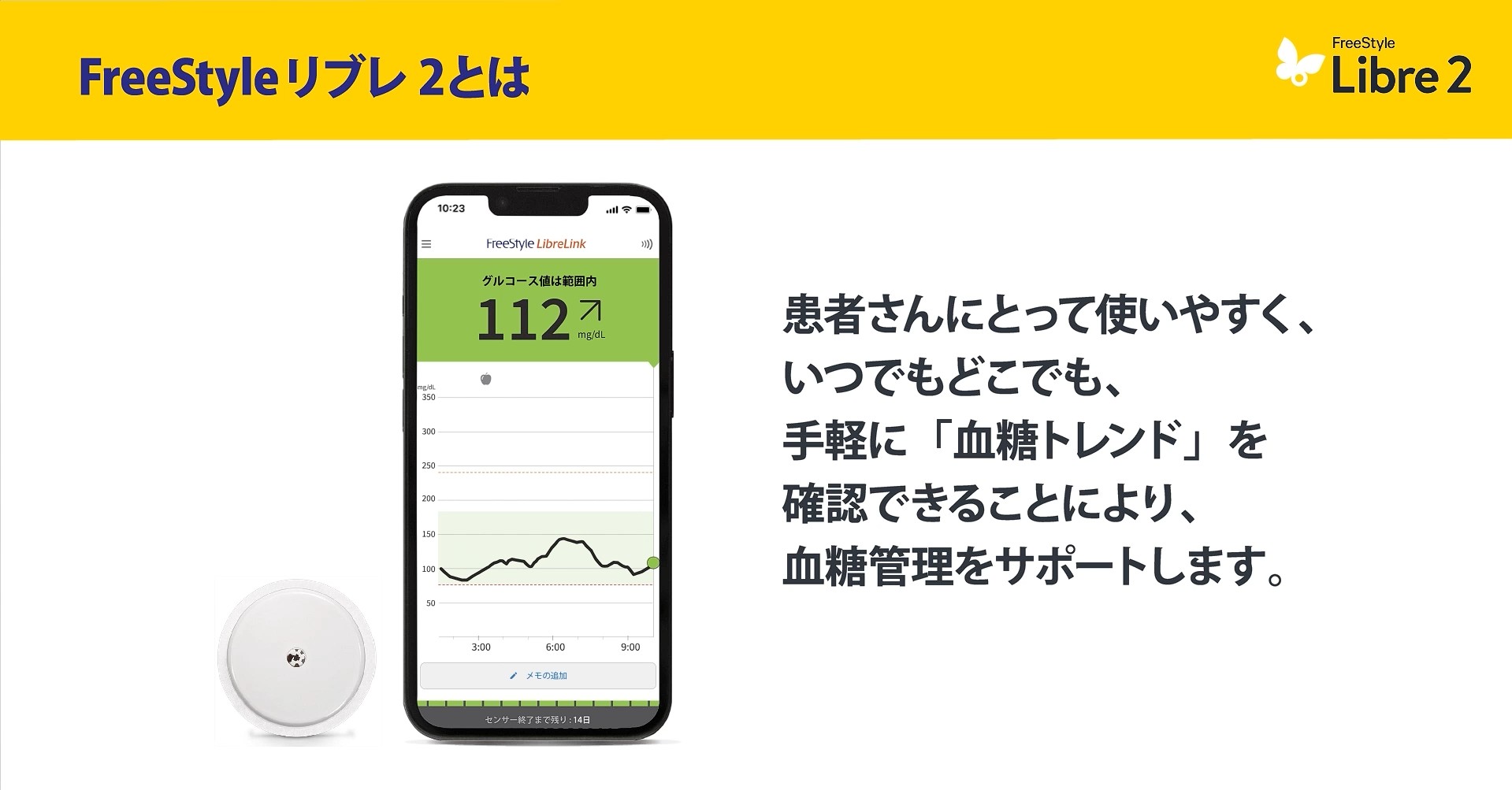 指先へ針を刺す必要がなく、腕に貼るセンサーを使って、血糖値の変動をいつでもスマートフォンなどで確認できます。